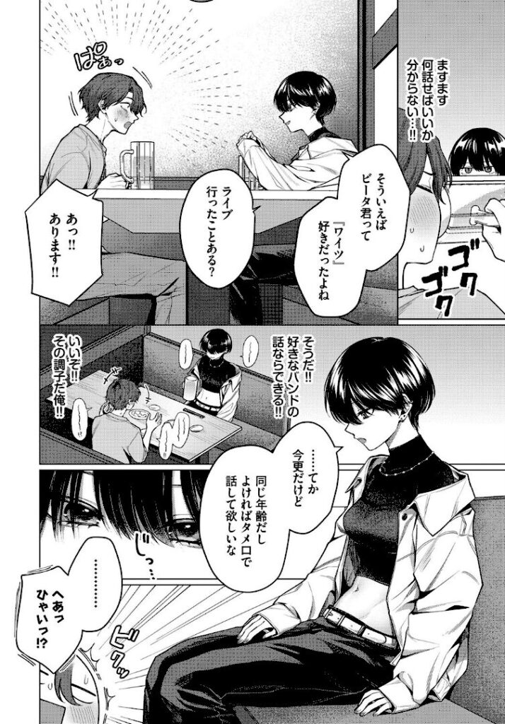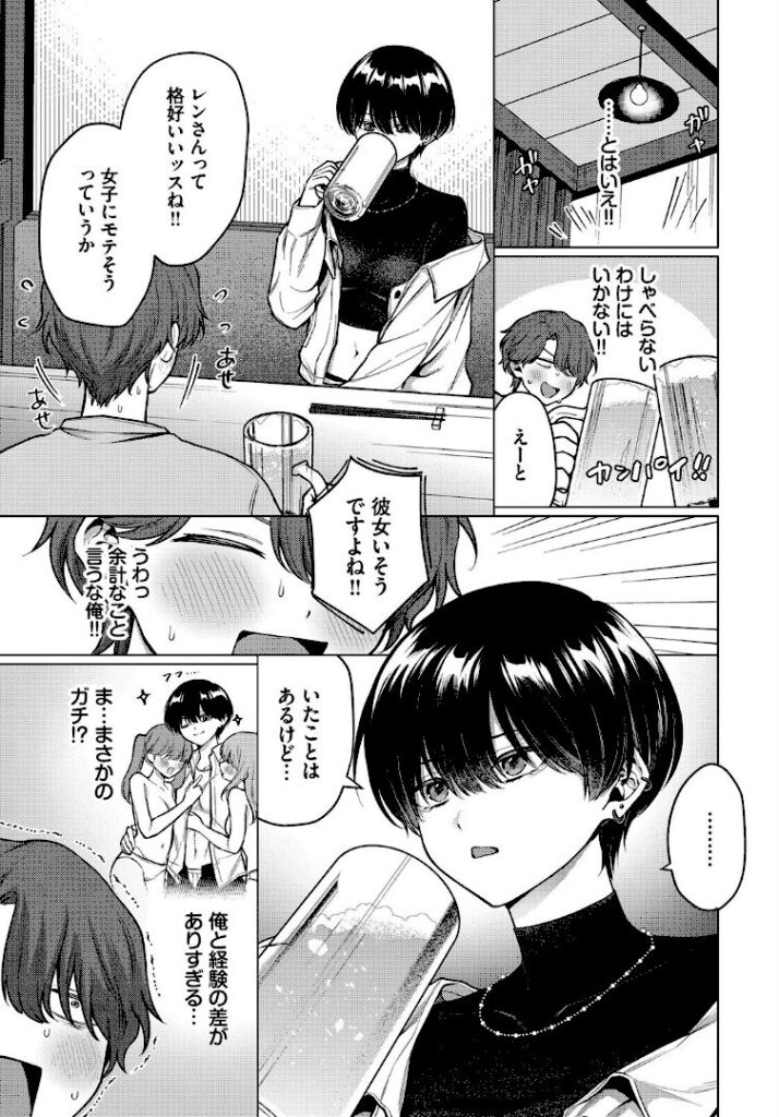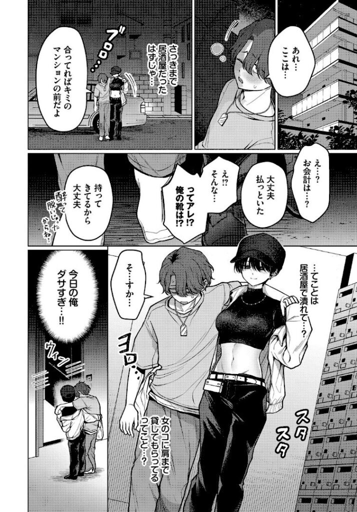 しかし童貞なりにリードしようとするも、から回って居酒屋で飲みすぎてしまい逆に介抱されてしまう。